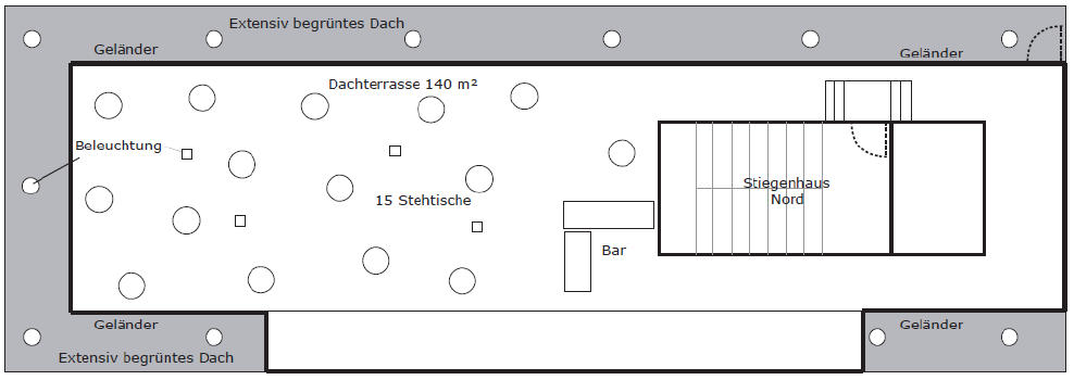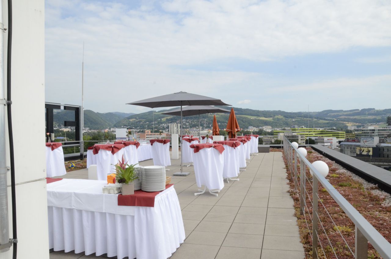 Die große Dachterrasse über dem 5. OG bietet Platz für bis zu 95 Personen und kann in den Monaten Mai bis September bis 23:00 genutzt werden, von Oktober bis Februar bis 22:00.